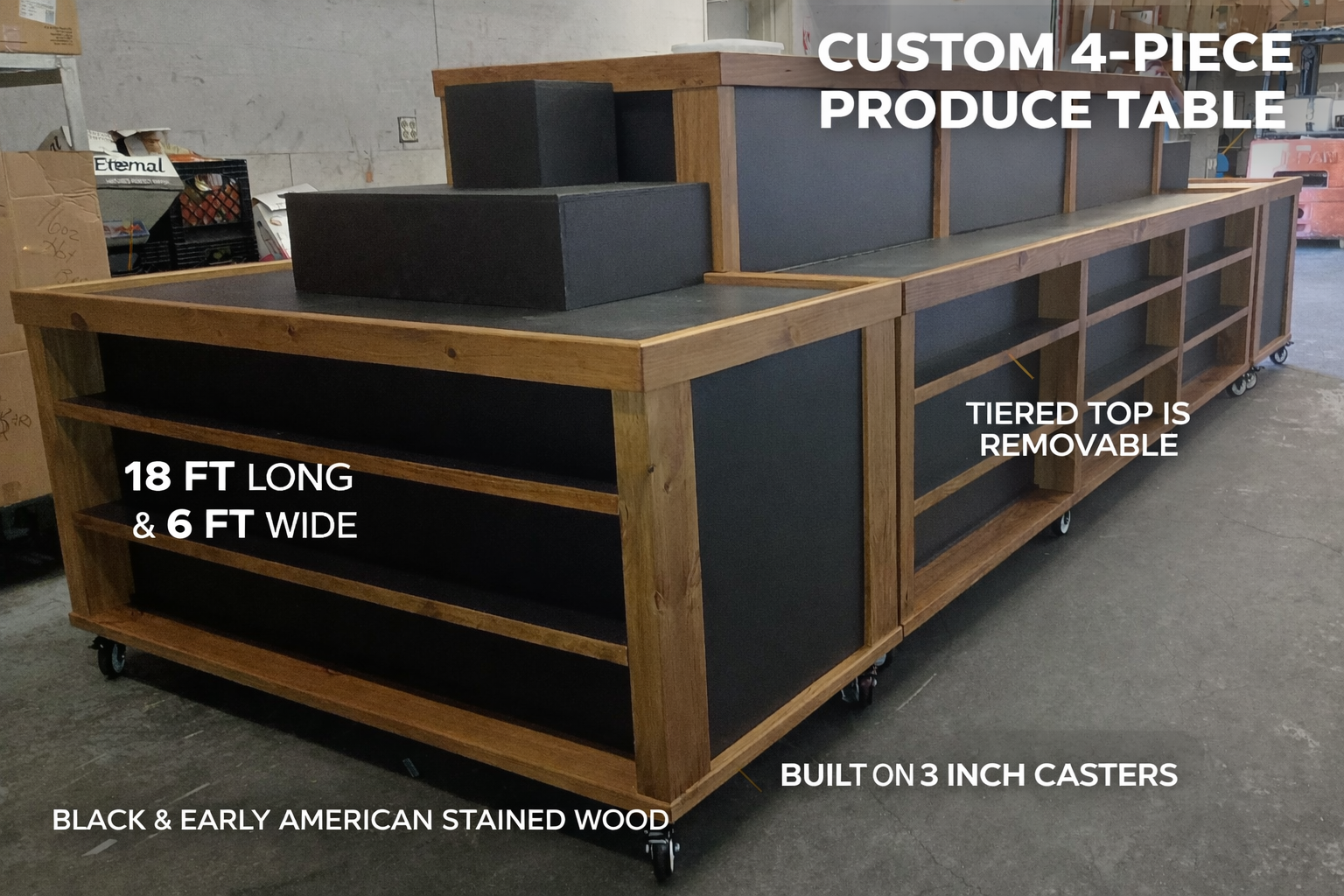 - Two Shelving Units – Each 3' wide with five shelves in varying depths: 18", 16", 14", 12", and 10". Shelves are shown at an angle for optimal product visibility, but can be built flat to suit your display needs. Features sturdy black bases paired with Early American stained rails for a warm, classic look.